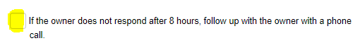 - If the Owner hasn’t responded after 8 hours follow up with the Owner over the phone and make a Note. Then tick the box in the Tasks section