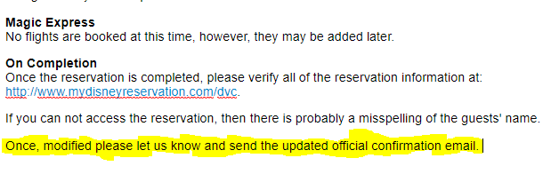 *Sometimes the Owner might be delayed in letting us know that a modification has been completed as they are awaiting the Official Confirmation Email before letting us know. However, you can check My Disney Experience to see if the modifications have been completed.